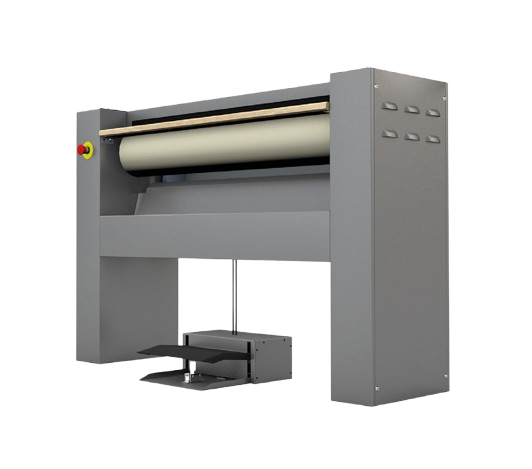 Todas las planchadoras industriales son eléctricas, con el mueble acabado en skinplate gris, cubeta en aluminio anodizado y panel superior en acero inoxidable. Por seguridad, todas incluyen una barra salvadedos. La superficie del rodillo es de poliéster, opcionalmente puede ser de Nomex, que permite trabajar a altas temperaturas, hasta 190ºC, sin desgastarse.